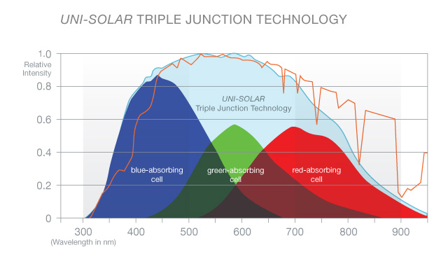 Uno dei pionieri nello sviluppo di celle solari utilizzando silicio amorfo è Uni-Solar. Usano un sistema a triplo strato (vedi illustrazione sotto) che è ottimizzato per catturare la luce dall'intero spettro solare).